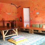 Ficamos no primeiro andar, em um quarto com banheiro privado (um banheiro imenso!), camas twins feitas de pallets, que estavam juntas e uma “meia escada” de madeira que nos serviu de apoio para nossas coisas!