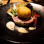O que me surpreendeu foi ter recebido o prato sem a tradicional gema, porém, com um bolinho empanado. Ao cortar o bolinho, descubro que era um ovo meio cru e empanado!