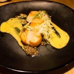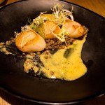 Bom, assim que nos trouxeram a cadeirinha para colocarmos o Léo (e água quente para esquentarmos a papinha dele), pedimos sugestão de prato. Pensamos em uma entradinha e nos aconselharam um Beef Tartare (carne 100% Angus 9,5€) e Grilled Scallops (12,50 € ).