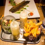 Para mim, ela sugeriu o catch of the day, que era um peixe chamado Mullets Fillet e como meu marido queria carne, ela sugeriu o Steak Black and Blue.