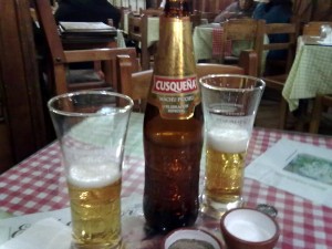 As cervejas peruanas são bem parecidas com as nossas. Vale a pena provar a de cada cidade. Além da Cusquena, gostamos também da Arequipena e da Pilsen! Mas o que faz fama na cidade não é a cerveja, mas o Pisco; em particular o Pisco Sour; Uma batidinha de Pisco com limão e clara de ovo! Bem suave, cremosa e gostosa! Acho que pagamos 15 soles pelo copo ao lado.