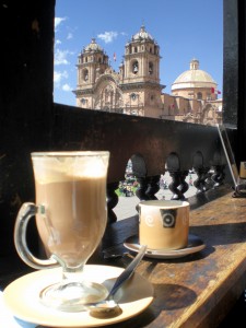 Ao lado da Plaza de Armas existem várias galerias com cafezinhos super charmosos com balcão na parte superior. E’ bem clichê, mas é gostoso sentar olhando o movimento e a beleza da praça; Porém, se você gosta de café e de chocolate quente forte, não vá com sede ao pote nos diversos barzinhos de Cuzco. O café é fraco (mesmo o expresso!) e o chocolate quente é feito de água quente e solução em pó (horrível)!