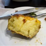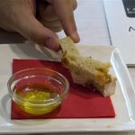 A primeira degustação continha uma cesta de pães e 4 porções com: batata recheada de queijo fresco (eu, amante de batata, achei divina!), fatias de queijo de cabra temperado (também deliciosa), alheira (uma “invenção” portuguesa maravilhosa. Trata-se de um enchido de varias carnes, geralmente de caça), filé de sardinha (o prato mais tradicional do país).