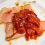 E’ bem saboroso, mas achei pesado no alho), cogumelos com queijo fresco e temperos (o Thiago adorou, eu nem tanto, mas não sou fã de cogumelo!), tomate com toucinho fumado e amêndoas (uma delícia) e por fim, a maior surpresa da degustação: pimentão com toucinho fumado.