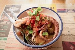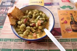 Como prato principal, vieram mais dois pratos deliciosos: um vinagrete com batata bolinha, cebola roxa e polvo defumado (boa combinação). Achamos delicioso (o elenquei como uma dos 8 pratos deliciosos que comemos em Portugal) e um prato de Favas com farinheira (a farinheira é um enchido criado pelos judeus portugueses durante a época da inquisição, como forma de simularem o consumo de carne de porco) e calabresa. Um prato quente e forte que, provavelmente, não deve estar no cardápio nos dias quentes!