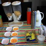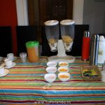 Ainda na mesa tem tigelas com fruta picada (nos dias que ficamos eram pêssegos em calda), suco e iogurte (morango); cereais, pão, geleia, margarina e tinha também uma cestinha com algum tipo de doce (bolacha ou alfajor).
