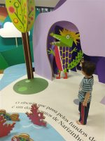 Dentro da sala, encontramos um gigante livro pop-up aberto, no qual a molecada pode entrar e correr por dentro do livro, e passear ao lado dos personagens como Narizinho, Emília e Pedrinho.