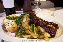 Depois de um tempo, chegaram nossos pratos. Vou ser sincera: a carne me decepcionou muito! Era um pedaço discreto e seco!Totalmente sem sabor!