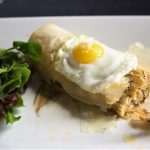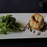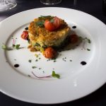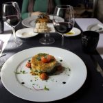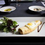 Para mim, um Crocante de Alheira com azeitonas pretas, grelo e ovo de codorniz. Para o Thiago, um Vol-au-vent de Morcela com queijo de cabra e maçã caramelizada.