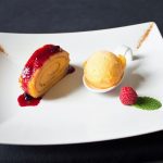 Satisfeitíssimos, foi o momento da sobremesa. Aqui, novamente, uma grande e deliciosa surpresa. Para mim, um Fondant de chocolate (também chamado de Petit Gateau em Portugal) com sorvete de framboesa e para o Thiago, uma Torta de laranja com puré de morango e sorvete de tangerina.